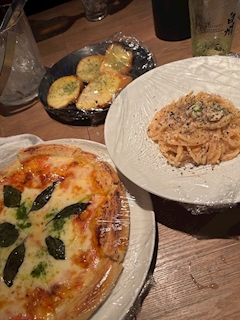 やほ! まいです😌😌 こないだレブロンの時の元店長のBAR行ってきた! めちゃめちゃお腹減ってて出前したよー🥡 パスタにピザ!!🍕🍝 こんな真夜中にハイカロリー過ぎない?! めちゃめちゃ背徳感やばかった🤤🩷 はなと一緒に行ったんだけど めちゃめちゃ二人で食べた気がする😂 はなはべろべろで記憶ないかもだけど パスタを美味しい美味しい言いながら幸せそうな顔してて なんかとても嬉しくなった 食いしん坊はなちゃんだーいすき!🥰 じゃ! またね!