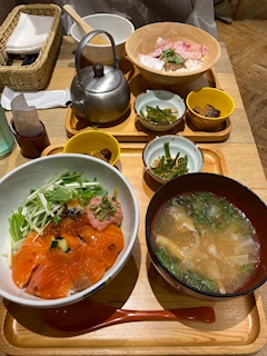 やっほー! はなです🌼 やっぱり日本人と言えば白米と汁ですよね🤤❤️ お母さんとランチ兼ディナー🍽 マルモキッチンてとこ行った! はなはサーモンとねぎとろといくら丼 そして豚汁のセット💖 お母さんはゴマだれの鯛茶漬けセット頼んでました🙂↕️ 丼も豚汁も当たり前においしくて お母さんのもひと口もらったけど もちろんおいしかったです🤤💕 やっぱり日本人は米と汁だよねん🫶🏻 はな🌼
