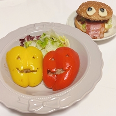 ひまりです❕ ハロウィンぽい 料理作ってみた🎃 パプリカの肉詰めと おばけハンバーガー🍔 急に作りたい!って 思ったから、 ハロウィングッズとかも もう全然売ってなくて、 切って貼ったりした だけだけど、 作ってるうちに愛着湧いてきて 可愛く見えてきた笑 来年はちゃんと準備して クオリティ高いの作りたい😖