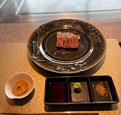 じゅりだよー♩ 上品なステーキをたべた🥹レアで焼いてもらった^ᴗ ̫ ᴗ^ 鉄板焼き屋さんだからフランベしてもらって!暖も取れた笑 定期的に行くとこなんだけどなに牛か忘れちゃった、、 これ付け合わせの調味料が天才で 醤油、わさび、しお、にんにくチップ! どれで食べても美味しいしにんにくとわさび合わせたらほんとにやばい😻 お昼からこんな贅沢うれしかった💫💘