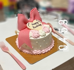じゅりだよー♩ あみの誕生日ケーキをおすそ分けしてもらったよー(◜𖥦◝ )🎀 おめでとう✨ リボンケーキほんとかわいい! リボンの部分は柔らかいチョコみたいなのだったけどなかなか美味しかった笑 お腹すいてたから朝方だけどケーキ美味しく食べれた🥹 さくら潰れてたけど5人で写真も撮ったよ〜😻👏🏻いい1年にしてね𐔌ᵔ꜆ ܸ•⩊•ᵔ 𐦯꜆💮