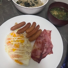 こんばんは! みりです! これ今日の夜ご飯だったんだけど 朝ご飯みたいじゃない??笑 ソーセージとベーコンと目玉焼き😂😂😂 全部残り物(´-ω-`) また豆腐のわかめスープ作ったんだけど 安定に美味しかった! もやしのナムルも作ったりしたよ〜🥺🥺 もう少し自炊頑張りたい!