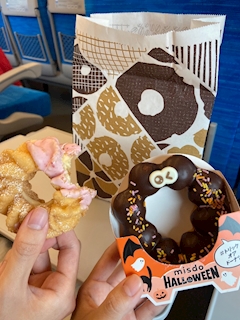 やっほー! はなです🌼 北九州着いて弟が博多の方に1回戻るって言うから ついでに1人飲みしよーと思ってついてった💨 小倉から博多まで新幹線で行くと近いのね! 弟と2人で新幹線乗る前に ミスドでドーナツ買って一緒に食べた🍩 ハロウィンのチョコポンデリング かわいくておいしかった〜🤤︎💕︎ 久しぶりに会って新幹線の中で弾丸トークした😂 離れると寂しいもんだね🥲 長期休暇の帰省を楽しみにしてる🫶🏻 はな🌼
