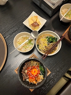 やっほー! はなです🌼 韓国料理たくさん出ます! こちらはケランチム💛 韓国の卵焼き🥚 熱々ふわふわでめちゃくちゃおいしかった🤤 こっちはチュモッパ〜〜🍙 手袋つけてまぜまぜするのが楽しかった👍🏻 お米大好物だからこれだけで満足☺️ とびこ入ってて食感ぷちぷちで最高でした🫶🏻 韓国のりが入ってたら大体優勝だよね🙂↕️ はな🌼