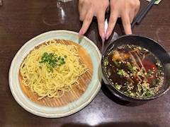 じゅりだよー♩ 営業おわり腹ぺこなときに雷神!いったよー🎀🎶 雷神ではじめてつけ麺たべた! 誰の手だー! めちゃめちゃおいしかった! この日は冷やし中華と結構究極の2択だった… 今日は出勤お休みです!🙇🏻♀️ またあしたお願いします✨️♡