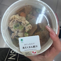 おはようございます! みりです! 昨日夜中に、無性に豚汁飲みたくなって 飲んだ(∩´ㅂ`∩).* ファミマの豚汁美味しすぎる♡ 具だくさんだったからすごい満足🩷 赤だしなのが最高👍 家で本当は作りたいけど めんどくさくていつも作れない💧 定期的に食べたい( /^﹏^)/