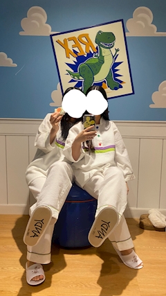 やっほー! はなです🌼 トイストーリーホテル泊まったら 絶対撮りたかったこれ! スリッパの裏にANDYって書いてあるんだよ〜💖 パジャマもバズの柄でかわいいの🥺 鏡の前でがんばって足裏が見えるようにしたんだけど 2人とももういい歳だから足が上がらん😂 めちゃくちゃ必死に息合わせて 腹筋力入れて足裏前向けた🤧🤧 いろいろと歳を感じるようになってきて とっても悲しい気持ちです🥲 はな🌼